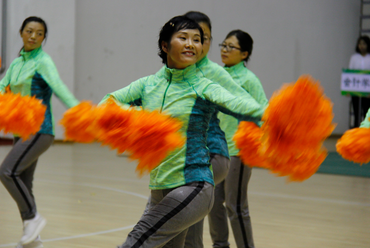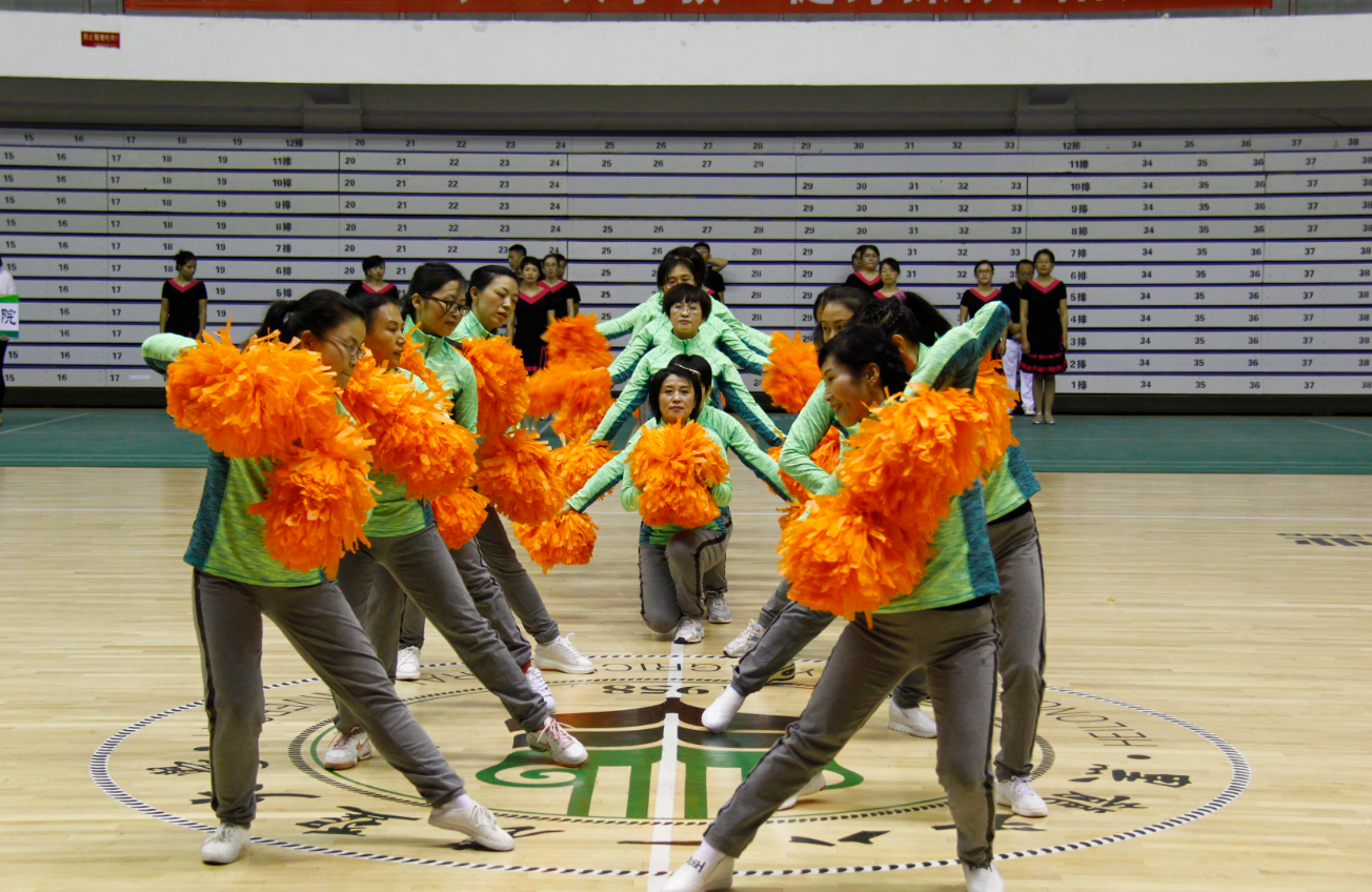 思政部的女老师们虽然年龄结构不占优势,训练时间也很有限,不仅要练习好广播体操的动作,还要用大量的时间和精力熟悉自选动作,但是我们还是坚持了下来,记不清有多少个夜晚我们在一起度过,说说笑笑,汗流浃背。正是女老师突破自我极限的挑战,使得我们的自选动作获得了14.69的高分。