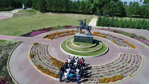在江桥抗战纪念馆内,师生们在讲解员的引领下,了解到江桥抗战的历史全貌,观看了战将领们使用过的武器、生活用品和大量珍贵的抗战图片,也亲眼目睹了日军侵华的累累物证。今天,站在凸显沧桑时光的浮雕前,同学们用心体验着历史的温度,江桥抗战那段金戈铁马的豪情与悲壮依旧历历在目。环境整洁、绿树环抱、鲜花绽放的江桥抗战纪念公园内,最醒目的是马占山将军乘着战骑的铜像:身姿挺拔、神情坚毅、昂首勒马、凝望前方,仿佛依稀可见当年血战沙场的情景。