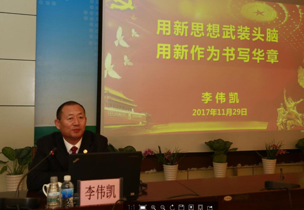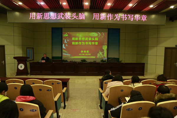 11月29日,学校纪委书记李伟凯为全校2017级研究生作题为“用新思想武装头脑,用新作为书写华章”主题报告。思想政治理论课教学研究部承担“习近平总书记系列重要讲话专题辅导”教学的教师及研究生院相关负责人聆听报告。