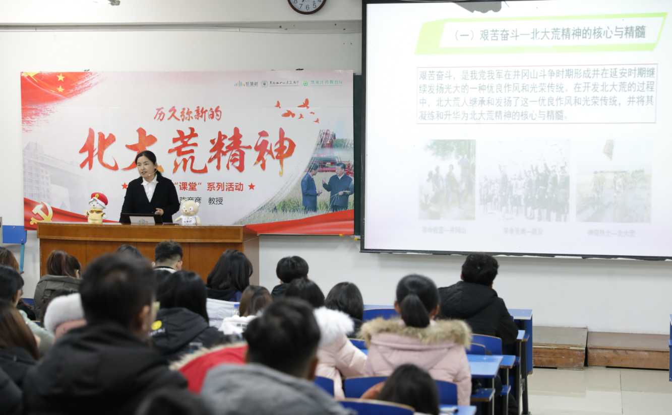 北大荒精神是黑龙江优秀精神资源的重要组成部分,是中华民族宝贵的精神财富之一。我校与黑龙江垦区同根同源,既是北大荒精神创造者,也是践行者和传播者。坚持用北大荒精神育人,将北大荒精神融入人才培养全过程一直是我校鲜明的办学特色。继省社科联授牌我校黑龙江省北大荒精神学术交流基地、精品在线开放课程《北大荒精神与文化》建成并上线之后,此次龙江共享“课堂”活动,进一步促进了我校线上线下教育教学资源的深度融合,构建了“北大荒精神”育人的长效机制,实现了北大荒优秀地域文化资源进教材、进课堂、进头脑的育人目的。