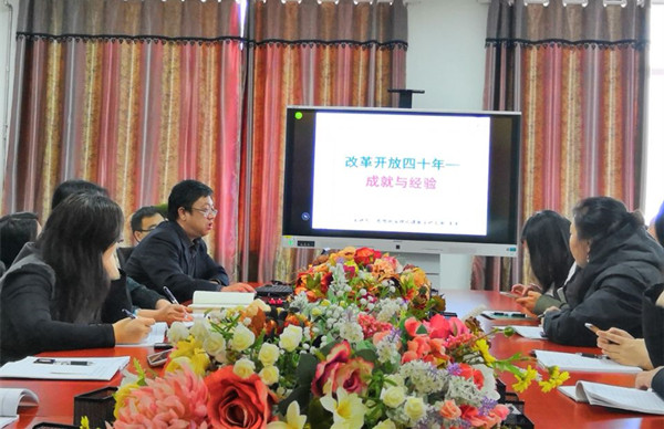 12月27日,在学校第十五次党代会即将召开之际,思政部全体党员教师通过专题学习习近平总书记在改革开放四十周年大会上的讲话,进一步统一干事创业的思想,凝聚思政部全体教工的思想和力量,激发党员教师的责任感和使命感,调动思政课教师在教学一线的岗位上,投身思政育人的热情中,为推动思政部朝内涵发展、特色发展和创新发展,提供更加有力的思想保证和精神动力。