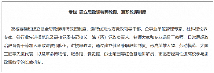 14.建设专兼结合的师资队伍。各地各校严格按照要求配备建强高校专职思政课教师、辅导员队伍,提高中小学专职思政课教师比例,实行思政课特聘教授、兼职教师制度,积极聘请党政领导、科学家、老同志、先进模范等担任思政课兼职教师。深入实施马yl23411永利集团院长(书记)培养工程,通过集中培养培训、委托重大项目、加强实践锻炼、开展国际国内访学等方式,培养一批青年马克思主义理论家。